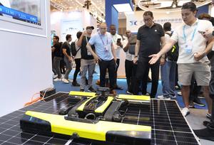 (260417) -- GUANGZHOU, 17 abril, 2026 (Xinhua) -- Imagen del 15 de abril de 2026 de visitantes observando un robot de limpieza con paneles fotovoltaicos en la edición número 139 de la Feria de Importación y Exportación de China, en Guangzhou, en la provincia de Guangdong, en el sur de China. La edición número 139 de la Feria de Importación y Exportación de China, también conocida como la Feria de Cantón, se inauguró aquí el miércoles. En el evento se ha habilitado un área de exposición para robots de servicio, que reúne a 46 empresas para mostrar las innovaciones tecnológicas y las capacidades de aplicación del sector de los robots de servicio de China.(Xinhua/Lu Hanxin) (oa) (ra) (vf)