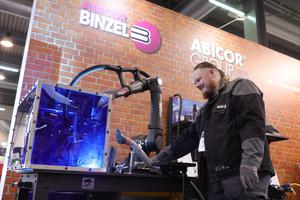 (260417) -- CELJE, 17 abril, 2026 (Xinhua) -- Imagen del 16 de abril de 2026 de un expositor presentando un robot de soldadura en la Feria Industrial Internacional, en Celje, Eslovenia. El evento de cuatro días, centrado en soldadura y corte, mantenimiento inteligente, digitalización industrial y logística, concluirá aquí el viernes. (Xinhua/Zeljko Stevanic) (oa) (vf)
