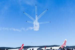 (260418) -- CANBERRA, 18 abril, 2026 (Xinhua) -- Personas observan la presentación del equipo de exhibición de acrobacias aéreas Roulettes de la Real Fuerza Aérea Australiana durante el Día de Puertas Abiertas del Aeropuerto de Canberra, en Canberra, Australia, el 18 de abril de 2026. (Xinhua/Chu Chen) (oa) (da)