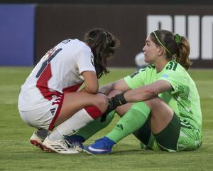 (260419) -- QUITO, 19 abril, 2026 (Xinhua) -- Imagen del 18 de abril del 2026 de la guardameta Mia Shalit (d), de Perú, reaccionando al término del partido de la Liga de Naciones Femenina de la CONMEBOL ante Ecuador, en el Estadio Olímpico Atahualpa, en Quito, capital de Ecuador. (Xinhua/Ricardo Landeta) (rl) (oa) (ah)