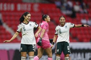 (260419) -- TOLUCA, 19 abril, 2026 (Xinhua) -- Imagen del 18 de abril de 2026 de Scarlett Camberos (i) y Alice Soto (d), de México, festejando una anotación durante el partido de clasificación para el Campeonato CONCACAF W 2026 ante Puerto Rico, celebrado en el Estadio Nemesio Diez, en Toluca, México. (Xinhua/Francisco Cañedo) (fc) (oa) (ah)