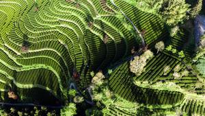 (260420) -- BEIJING, 20 abril, 2026 (Xinhua) -- Vista aérea tomada con un dron el 18 de abril de 2026 de agricultores recolectando hojas de té en un jardín de té, en la aldea de Huazhishan del municipio de Tunbao, en la prefectura autónoma tujia y miao de Enshi, en la provincia de Hubei, en el centro de China. (Xinhua/Wen Lin) (oa) (ah) (ce)