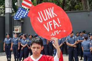 (260420) -- CIUDAD QUEZON, 20 abril, 2026 (Xinhua) -- Un hombre sostiene un cartel con un lema en contra de los ejercicios militares conjuntos anuales de Filipinas y Estados Unidos durante un mitin de protesta afuera de la puerta del Campo Aguinaldo, en Ciudad Quezón, Filipinas, el 20 de abril de 2026. En medio de los altos precios del combustible y las duras condiciones de vida, Filipinas y Estados Unidos lanzaron el lunes sus ejercicios militares conjuntos anuales en Manila, la capital de Filipinas, con la participación de otras cinco naciones. (Xinhua/Rouelle Umali) (ah) (vf)
