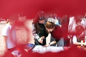 (260420) -- ALMATY, 20 abril de 2026 (Xinhua) -- Una maestra enseña a los alumnos a escribir caligrafía china en el evento del Día Internacional de la Lengua China 2026, en Almaty, Kazajistán, el 20 de abril de 2026. Un evento conmemorativo con motivo del Día Internacional de la Lengua China 2026 se celebró aquí el lunes. (Xinhua/Li Renzi) (oa) (ah) (ce)