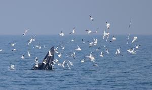 (260423) -- NANNING, 23 abril, 2026 (Xinhua) -- Imagen del 13 de enero de 2026 de un rorcual de Bryde avistado frente a la isla de Weizhou, en la ciudad de Beihai, en la región autónoma de la etnia zhuang de Guangxi, en el sur de China. Los rorcual de Bryde, una especie protegida de primera categoría en China que puede alcanzar los 15 metros de longitud y pesar hasta 20 toneladas, prácticamente habían desaparecido de estas aguas durante décadas. Pero ahora, este tramo del golfo es el único lugar costero conocido del país donde los animales aparecen de forma regular cada año, llegando en diciembre y permaneciendo hasta abril. (Xinhua/Academia de Ciencias de Guangxi) (da) (ra) (ce)