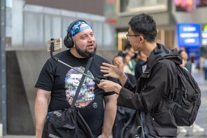 (260424) -- CHONGQING, 24 abril, 2026 (Xinhua) -- Imagen del 22 de abril de 2026 de un turista de Países Bajos comunicándose con un bloguero chino en Jiefangbei, un área de negocios, en el distrito de Yuzhong de Chongqing, en el suroeste de China. Mientras disfrutan de la deliciosa comida, contemplan los paisajes y experimentan la colorida cultura, los turistas extranjeros también se ven inmersos en la "sensación de seguridad china", que generalmente se refiere a la libertad de pasear solos a altas horas de la noche, la facilidad para recuperar pertenencias perdidas u olvidadas y la tranquilidad que se siente cuando los niños pequeños se divierten solos en la comunidad. (Xinhua/Huang Wei) (da) (vf)