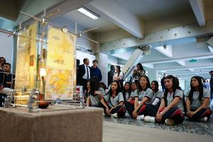 (260424) -- BOGOTA, 24 abril, 2026 (Xinhua) -- Imagen del 23 de abril de 2026 niños observando la obra "La luz del sueño en los caracteres chinos" durante la celebración del Día Internacional del Idioma Chino en la Universidad Jorge Tadeo Lozano, en Bogotá, Colombia. Estudiantes y cuerpo docente de la Universidad Jorge Tadeo Lozano de Bogotá celebraron el jueves el Día Internacional del Idioma Chino en un evento en este centro educativo que lleva 13 años enseñando mandarín. (Xinhua/Andrés Moreno) (am) (da) (vf)