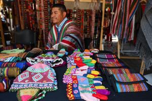 (260426) -- SANTIAGO, 26 abril, 2026 (Xinhua) -- Imagen del 25 de abril de 2026 de un hombre mostrando piezas tejidas en lana en un festival de lana, en Santiago, Chile. (Xinhua/Zhou Jiayi) (da) (ah) (ce)