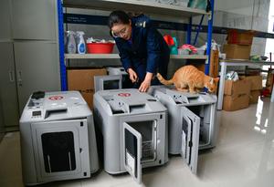 (260429) -- GUIYANG, 29 abril, 2026 (Xinhua) -- Una empleada acomoda transportadoras inteligentes para mascotas en la Estación del Ferrocarril del Norte de Guiyang, en Guiyang, en la provincia de Guizhou, en el suroeste de China, el 29 de abril de 2026. Previo a las vacaciones del Primero de Mayo, la demanda de los recién introducidos servicios de transporte de mascotas por ferrocarril de alta velocidad ha aumentado. (Xinhua/Yang Wenbin) (jg) (ah) (vf)