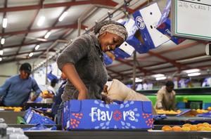 (260429) -- PROVINCIA DEL NOROESTE, 29 abril, 2026 (Xinhua) -- Imagen del 28 de abril de 2026 de trabajadores empaquetando cítricos en una fábrica, en Brits, en la Provincia del Noroeste, Sudáfrica. La temporada de cosecha de cítricos en Sudáfrica, uno de los principales exportadores mundiales de cítricos frescos, se extiende de febrero a septiembre. (Xinhua/Chen Wei) (jg) (ah) (ce)
