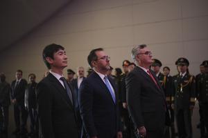 (260429) -- CARACAS, 29 abril, 2026 (Xinhua) -- Imagen del 28 de abril de 2026 del embajador de China en Venezuela, Lan Hu (i), el ministro de Relaciones Exteriores de Venezuela, Yván Gil (c), y el embajador de Rusia en Venezuela, Sergey Melik-Bagdasarov (d), rindiendo homenaje ante la tumba de Simón Bolívar durante la ceremonia por el 30 aniversario de la Asociación Estratégica entre China y Rusia, en el Panteón Nacional de Venezuela, en Caracas, Venezuela. (Xinhua/Xu Yongzheng) (jg) (ah) (ce)