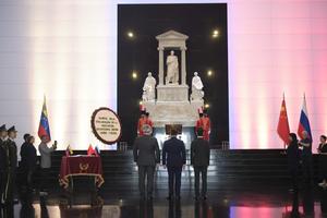 (260429) -- CARACAS, 29 abril, 2026 (Xinhua) -- Imagen del 28 de abril de 2026 del embajador de China en Venezuela, Lan Hu (c-d), el ministro de Relaciones Exteriores de Venezuela, Yván Gil (c), y el embajador de Rusia en Venezuela, Sergey Melik-Bagdasarov (c-i), rindiendo homenaje ante la tumba de Simón Bolívar durante la ceremonia por el 30 aniversario de la Asociación Estratégica entre China y Rusia, en el Panteón Nacional de Venezuela, en Caracas, Venezuela. (Xinhua/Xu Yongzheng) (jg) (ah) (ce)